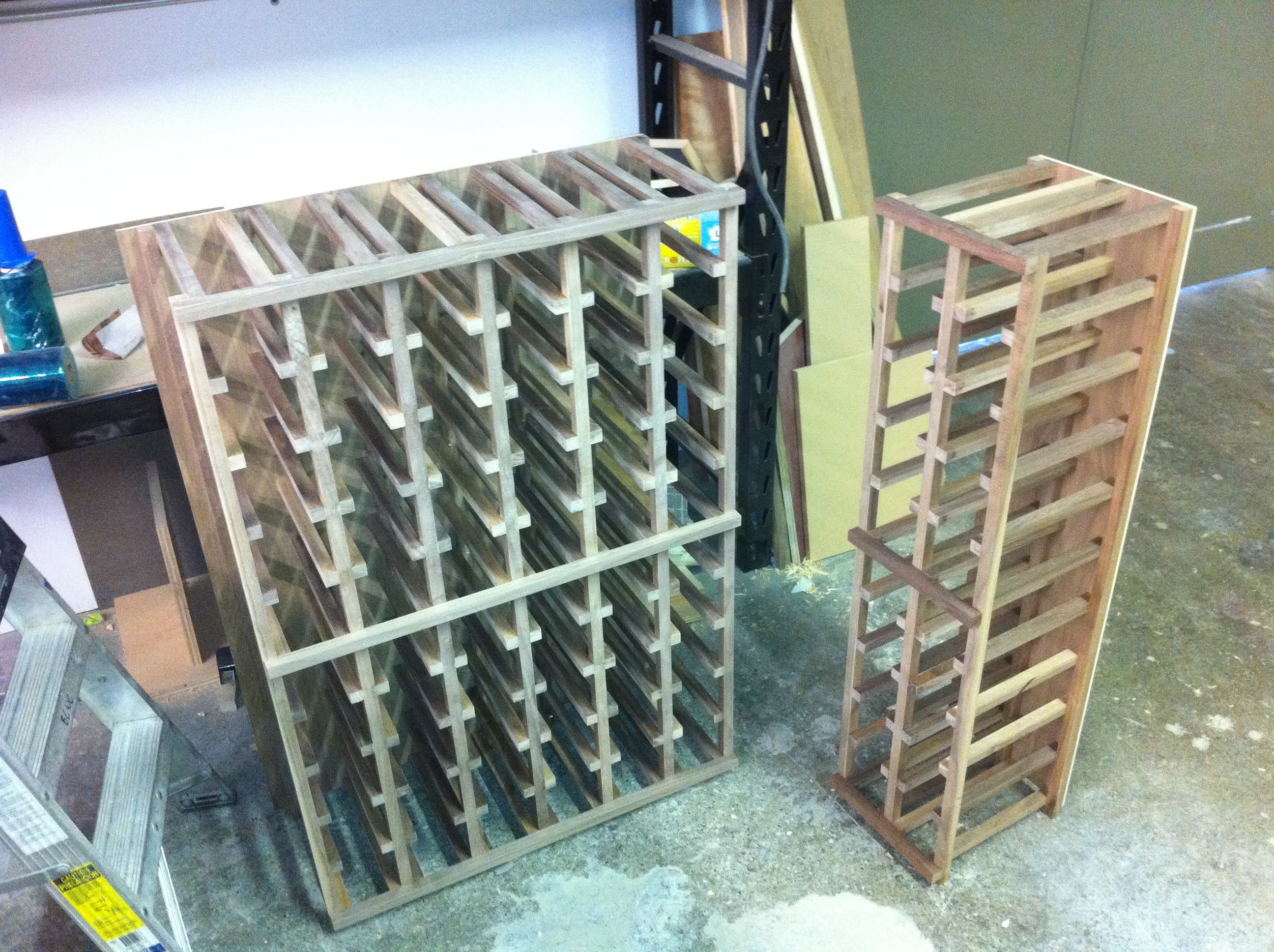DURING – using burl walnut Henry crafted lean storage racks for easy viewing, and to maximize the space. notice that the Champaign bottles don’t fit in the generic rack above. Henry crafted storage for a dozen bottles of bubbly, no wasted space here.