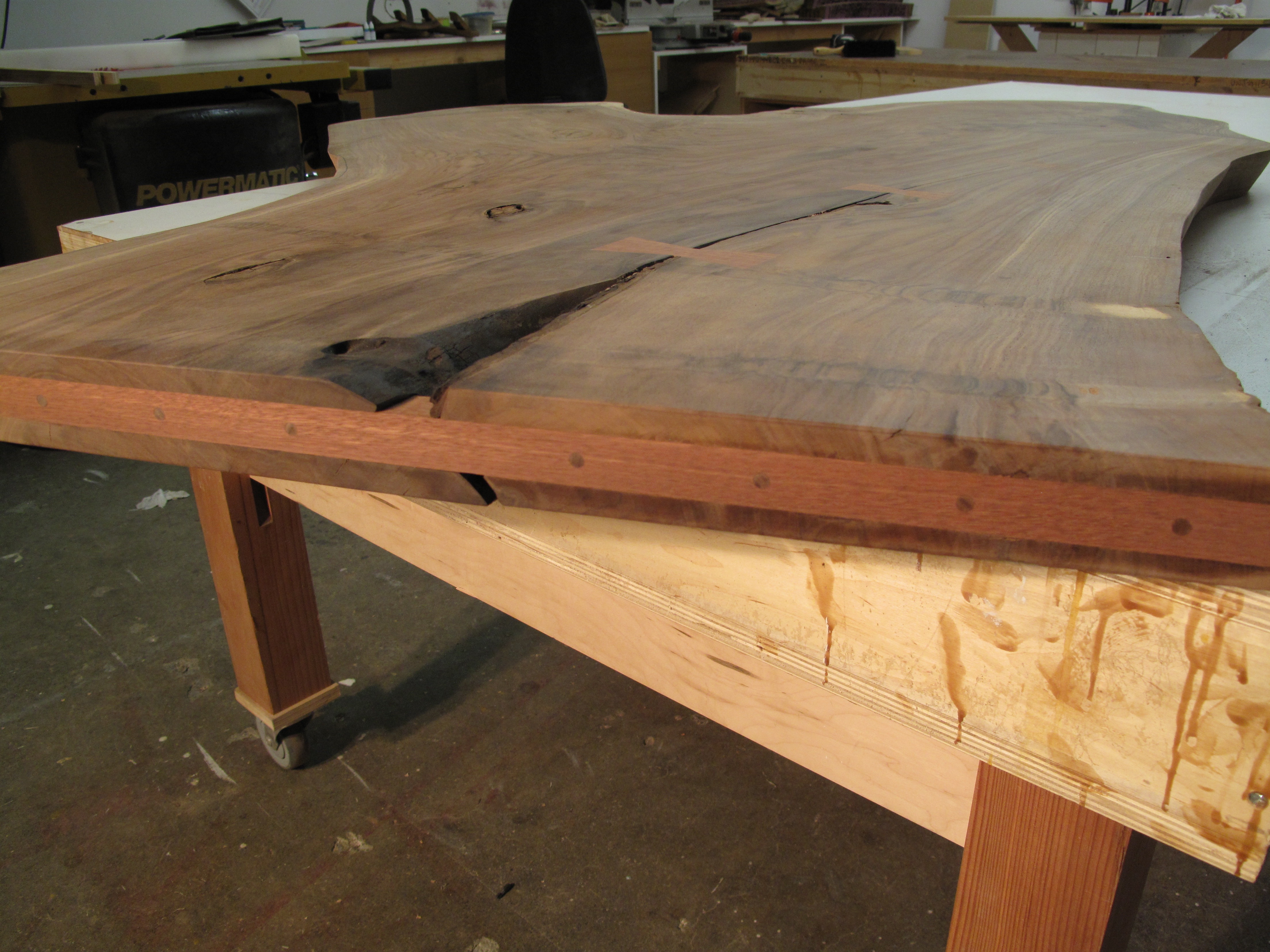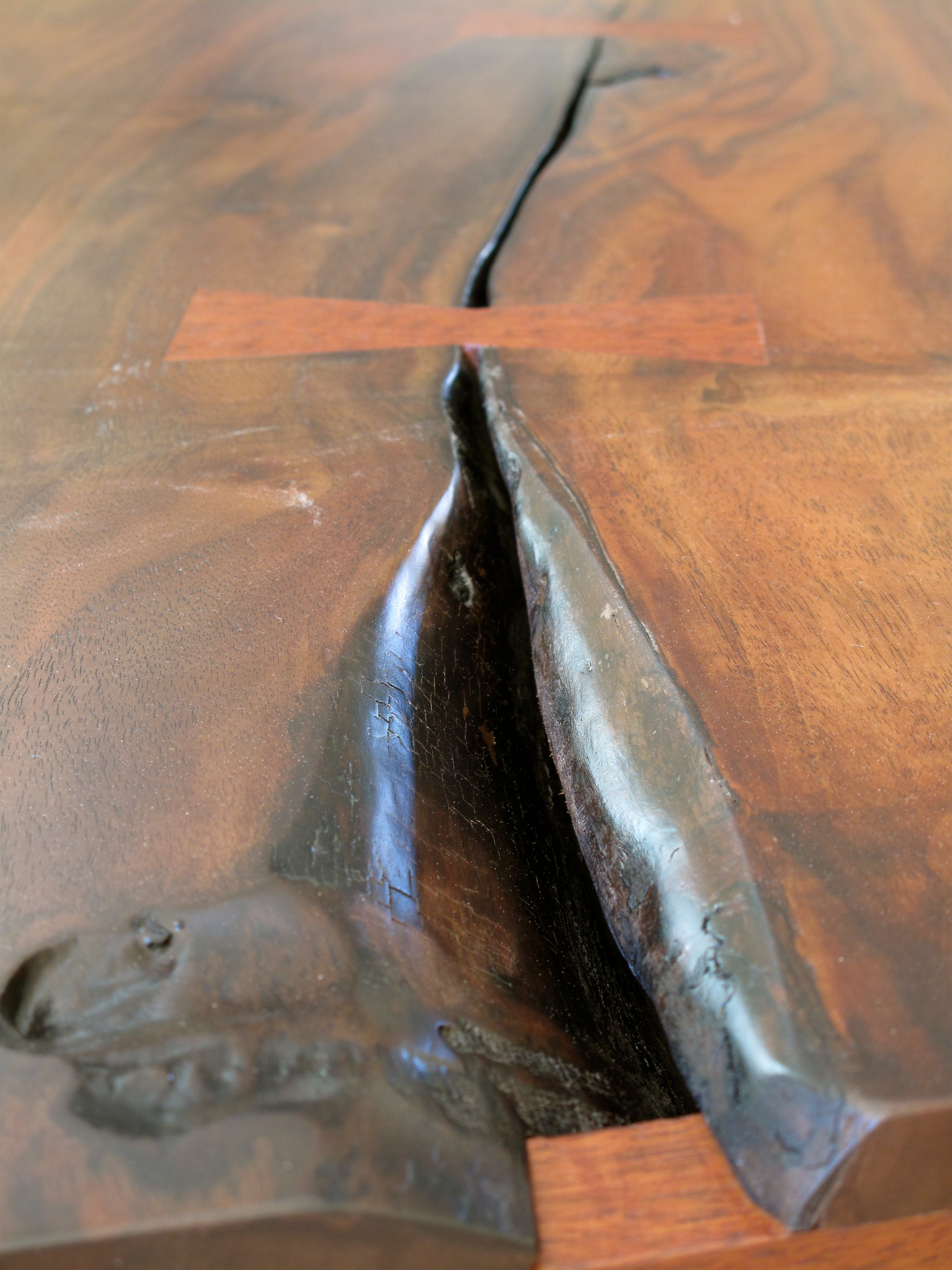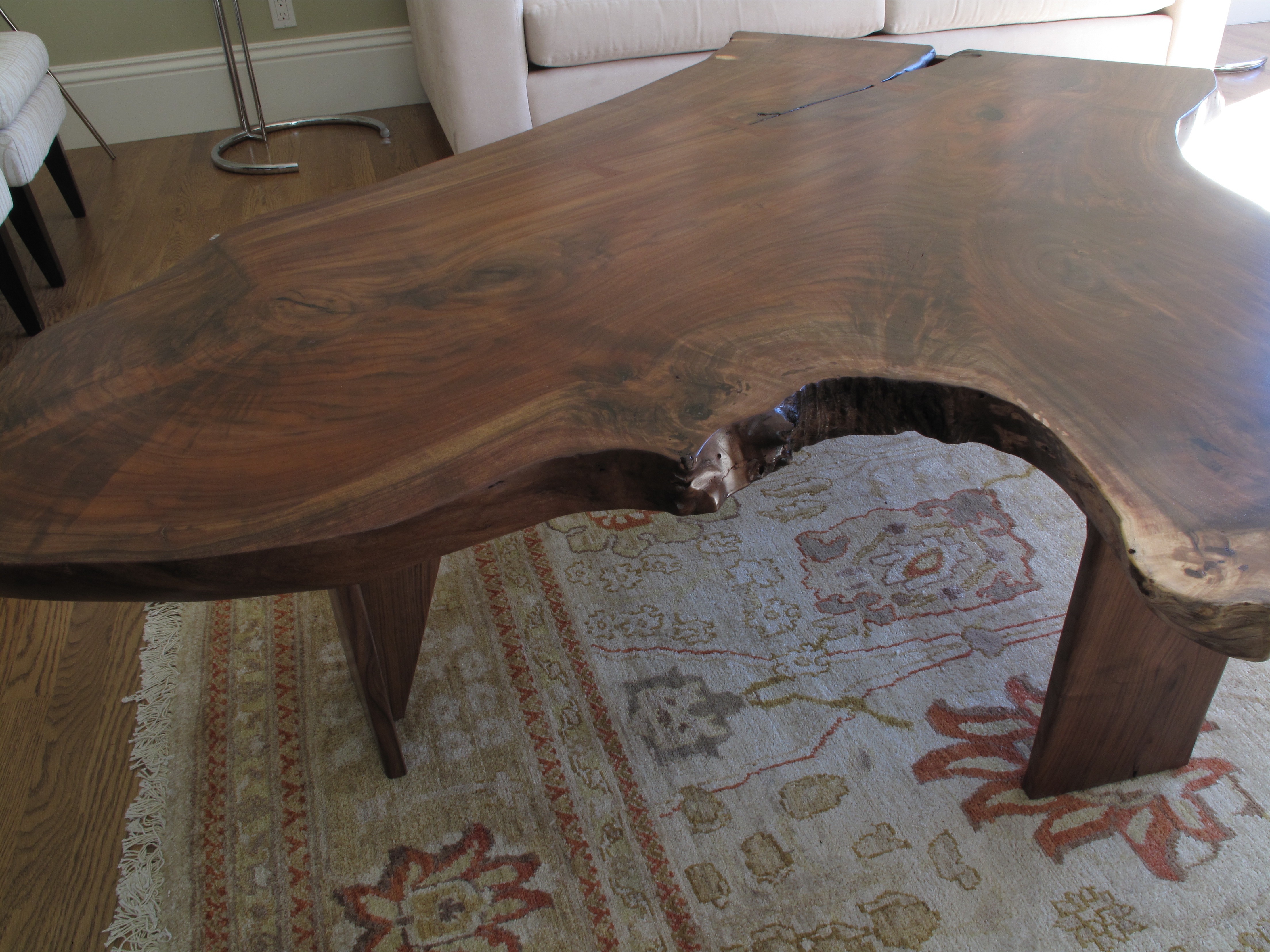 This unique piece of burl walnut was salvaged by a contractor I was building a kitchen for, he asked if I could make it into a coffee table to show with the home. Immediately drawn to the unique features of this wood I added structure and design with Australian Jara dove tales and end cap; to complete the look I used live edge finishing.