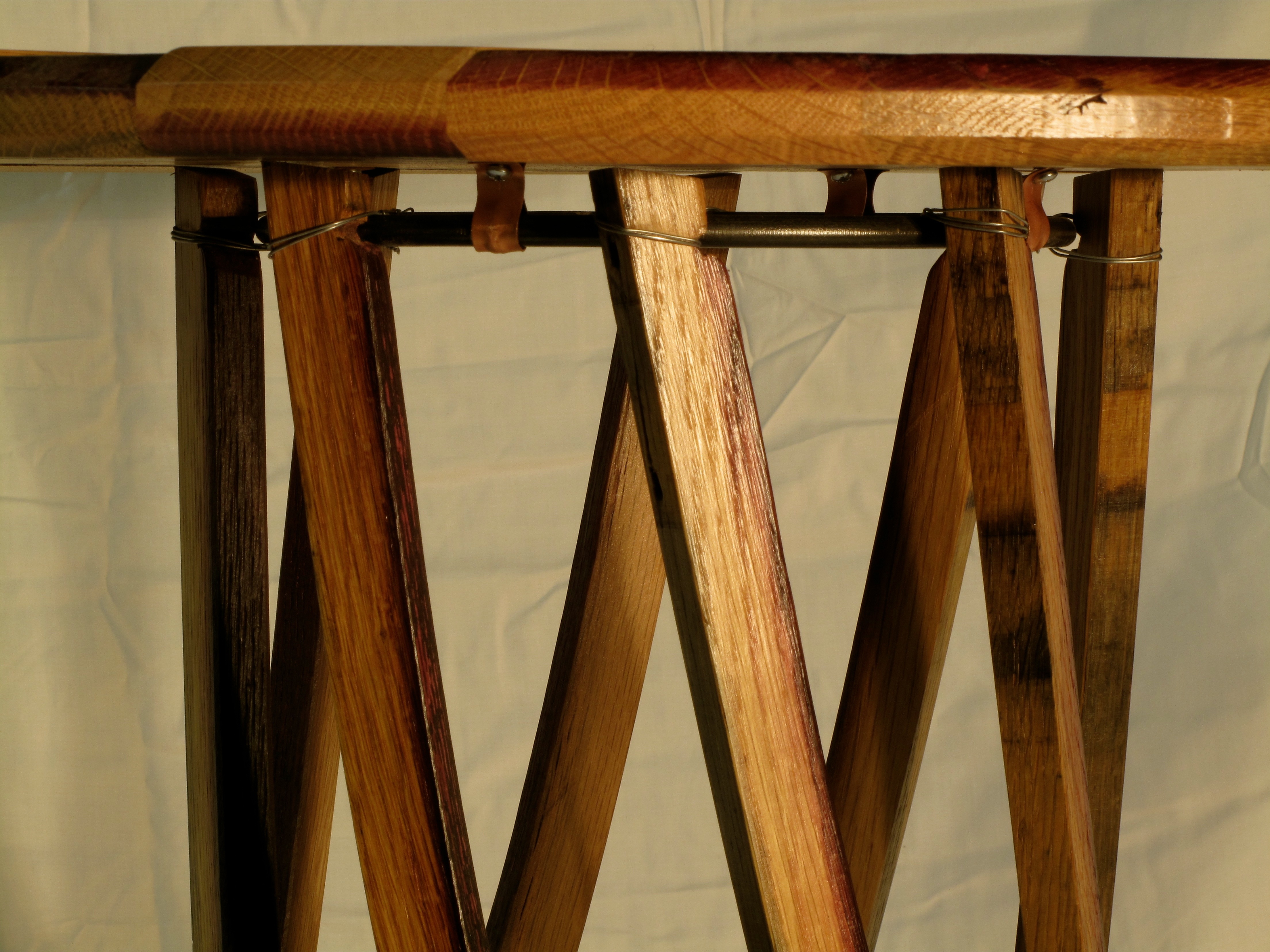 Henry trimmed and turned the barrel sides then connected the legs with a narrow rolled steel hoop creating a twisted pedestal stand. To show off the wine aged wood Henry took apart the barrel end, alternated the slats, then reassembled and finished for a dramatic wine wood top.
