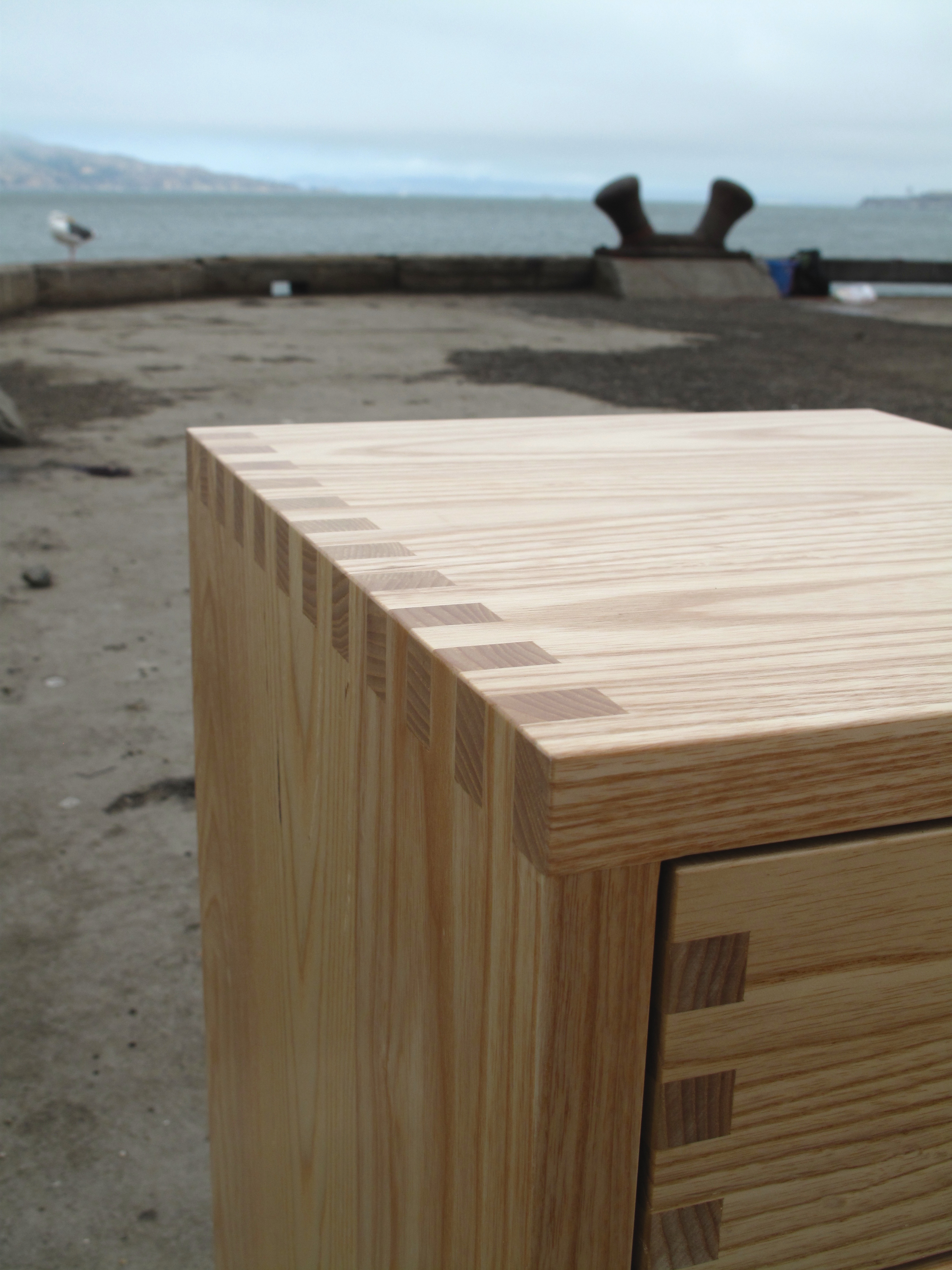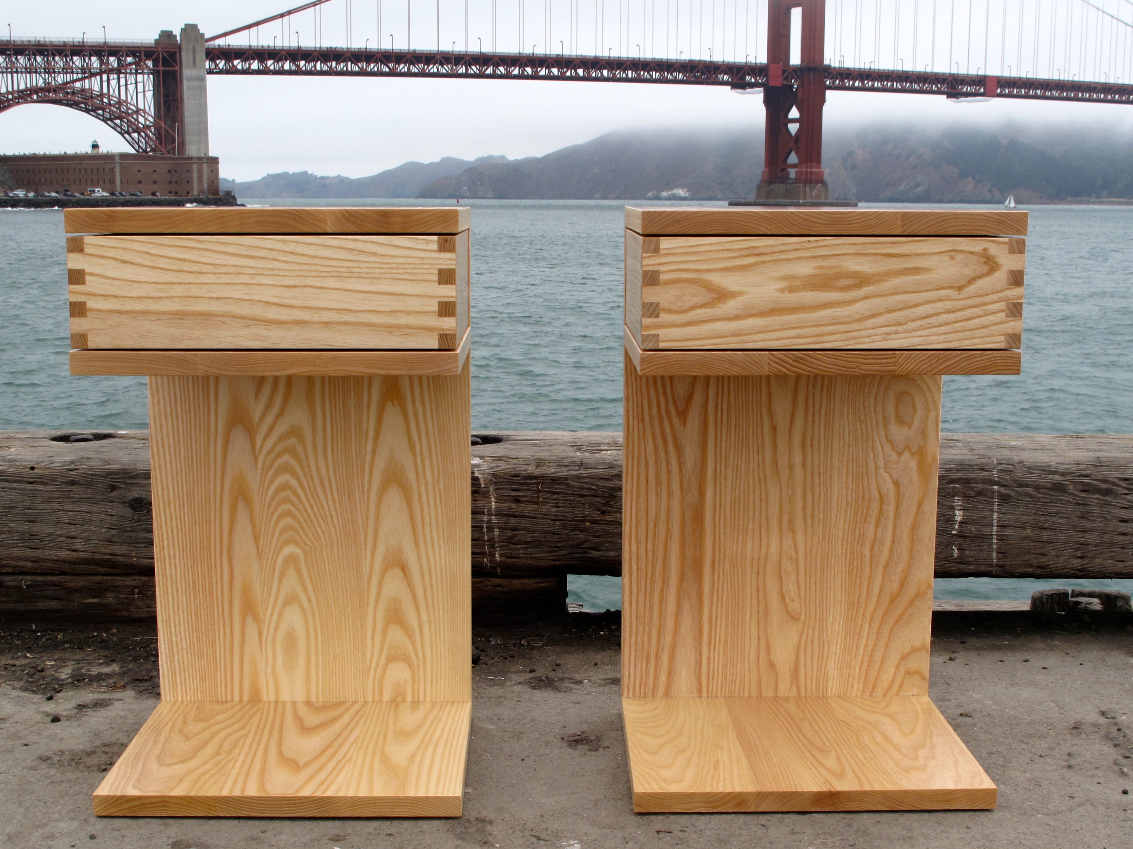 Crafted from solid Ash – a sustainable, American, hard wood – with a prominent grain in an attractive light cream to brown hue. Henry chose a strong wood to work with the box joints used throughout the design. Box joints are one of the strongest type of joint (arguably stronger than dove tail) allowing the tables to be constructed without a screws, nails or biscuits. One of the more challenging joints to master Henry’s decade of wood craftsmanship stands out in construction of these side tables.