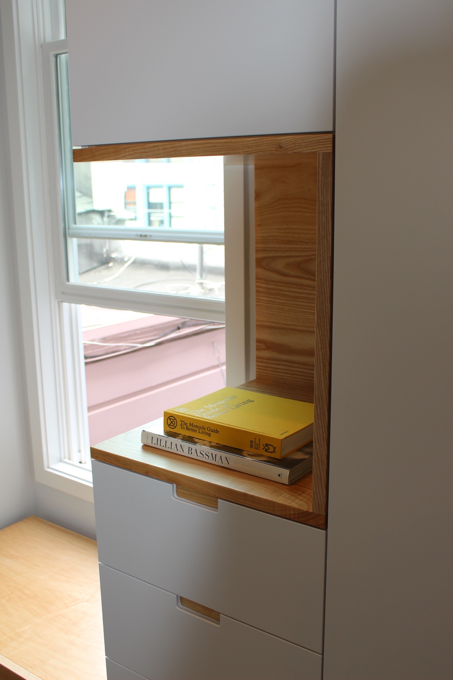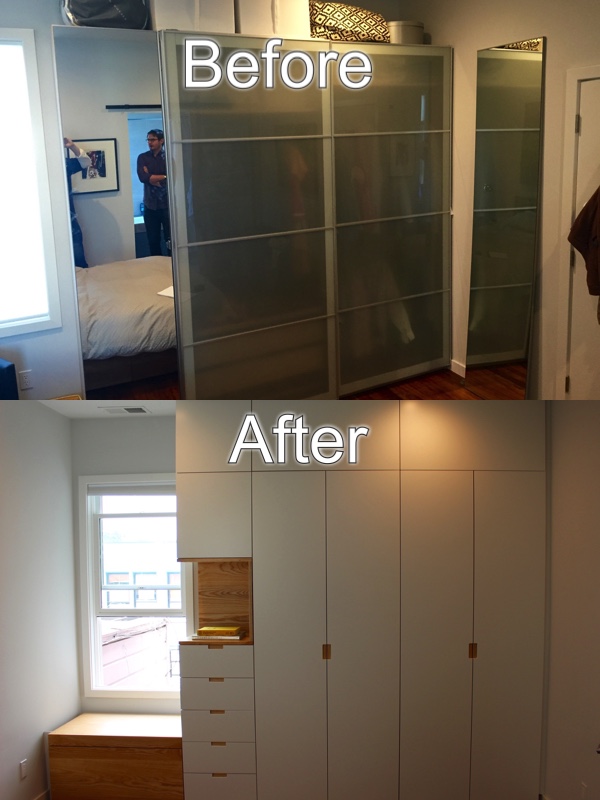 Henry worked directly with the client to custom design, CAD draft, build, finish and install this massive floor to ceiling closet. Henry used Solid Ash and custom mixed decorator white paint grade finish to create a modern two tone effect.