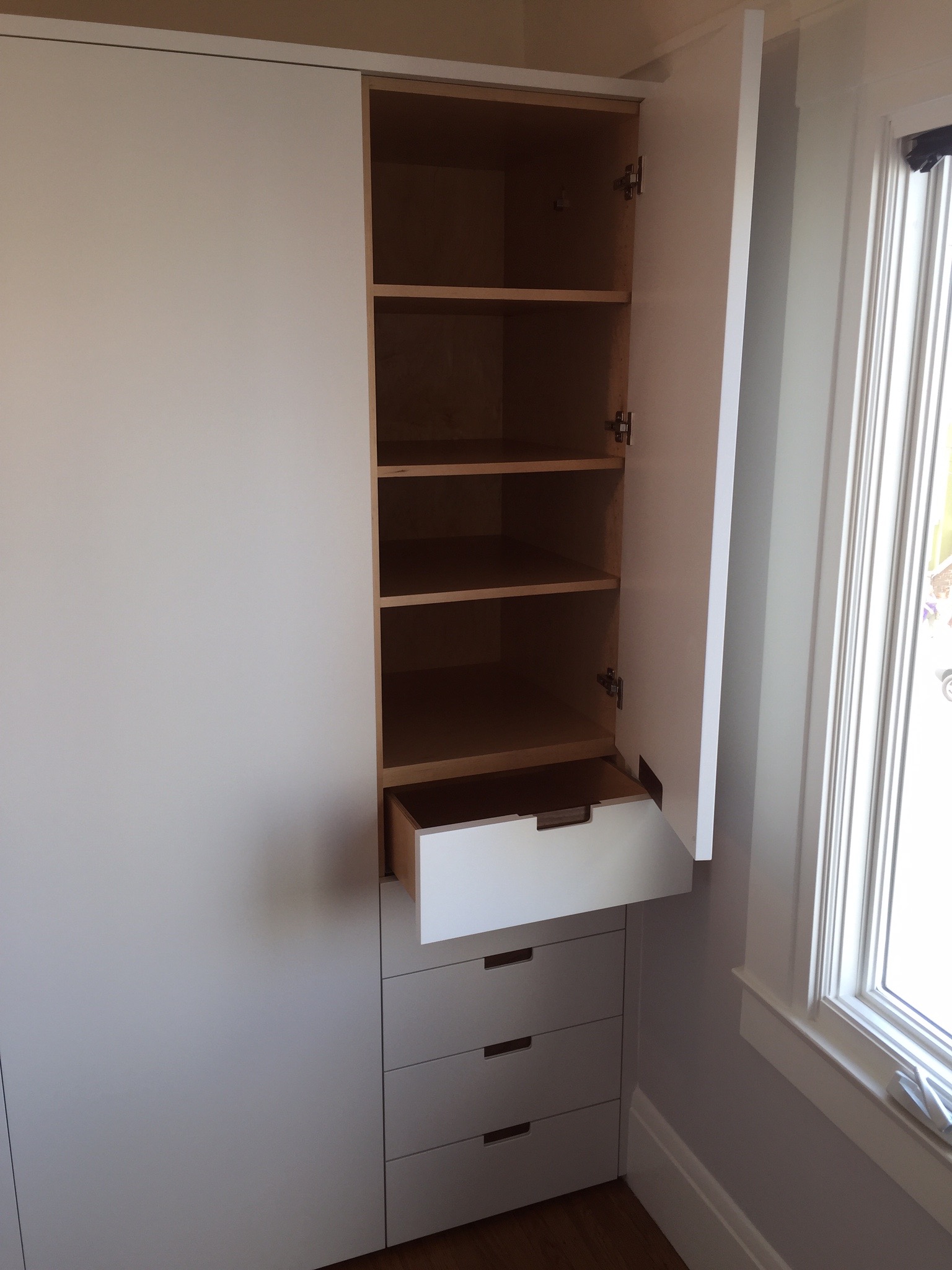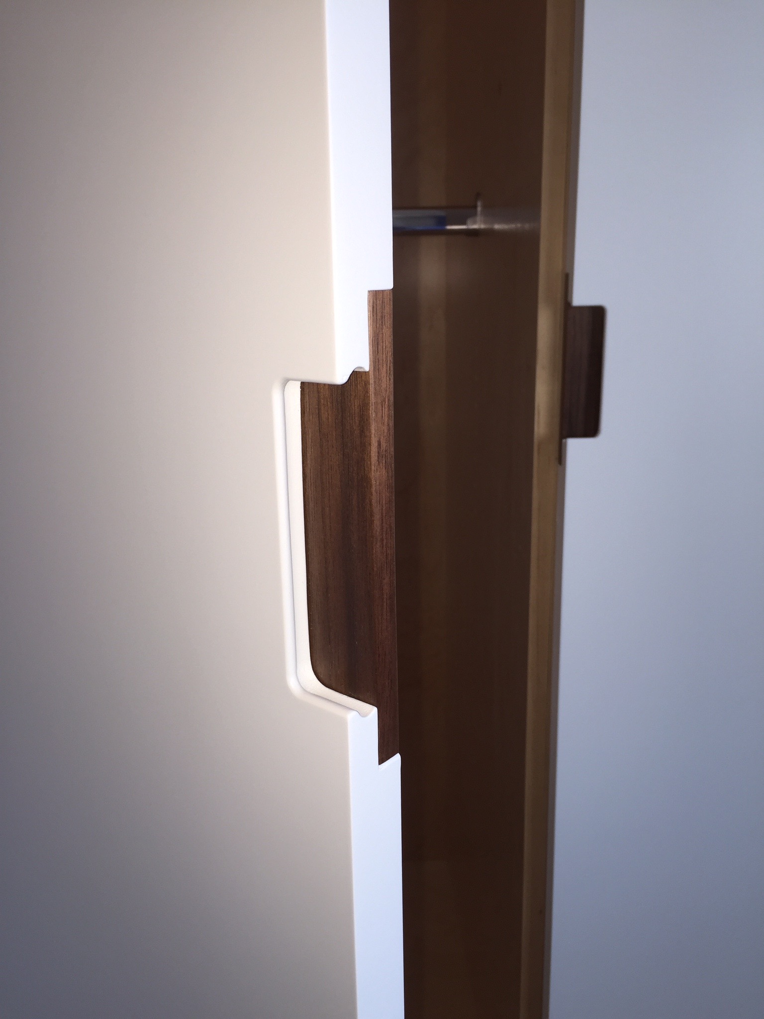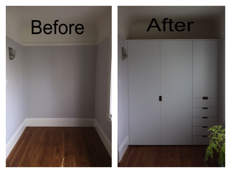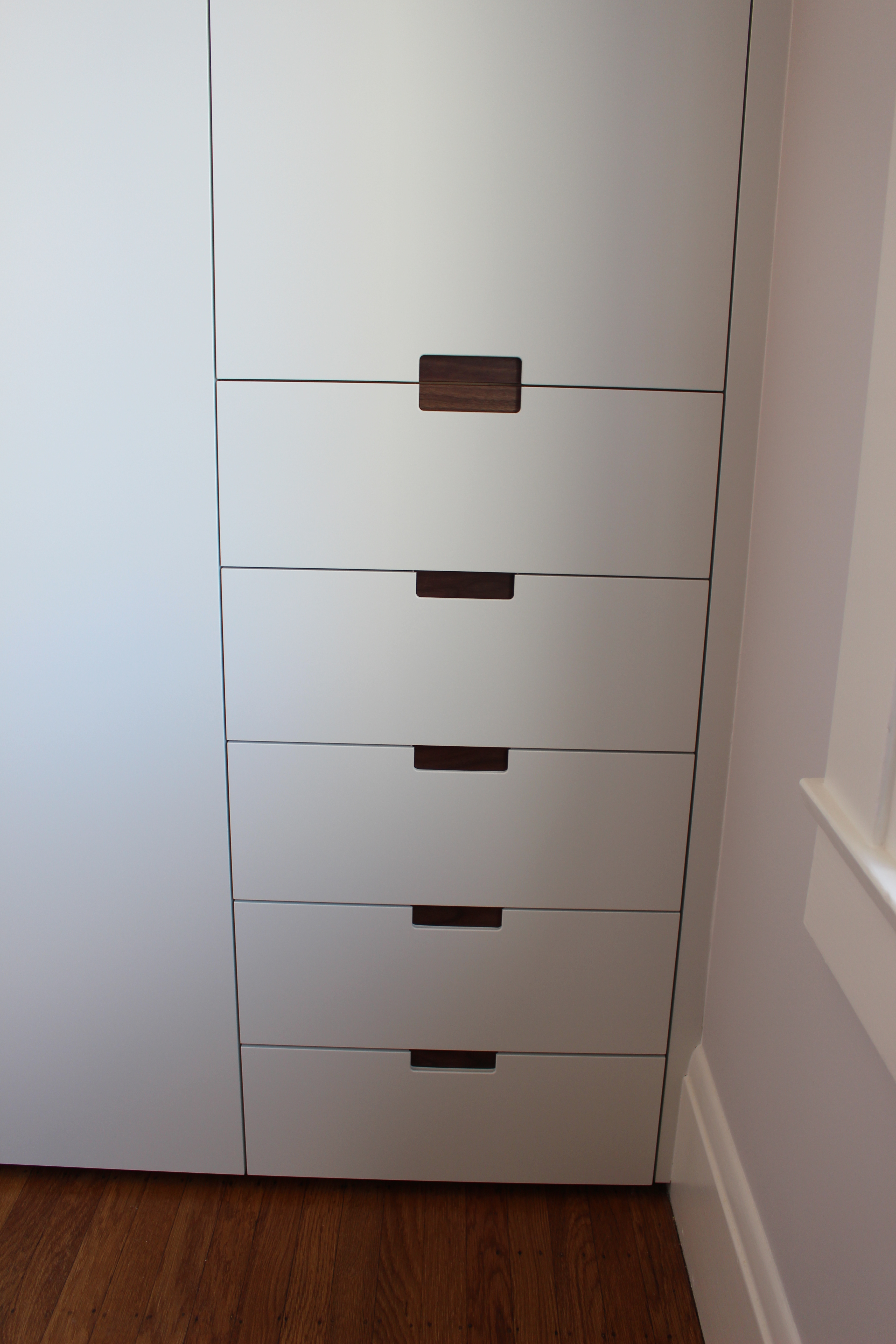 Henry designed the closet around Yuki and Lennart’s desired storage configuration. Going beyond a standard built in closet Henry hand crafted custom draw pulls with solid Walnut inlays and personally finished the doors and drawers in his own mix of “Designer White” – a long lasting matte white spray finish.