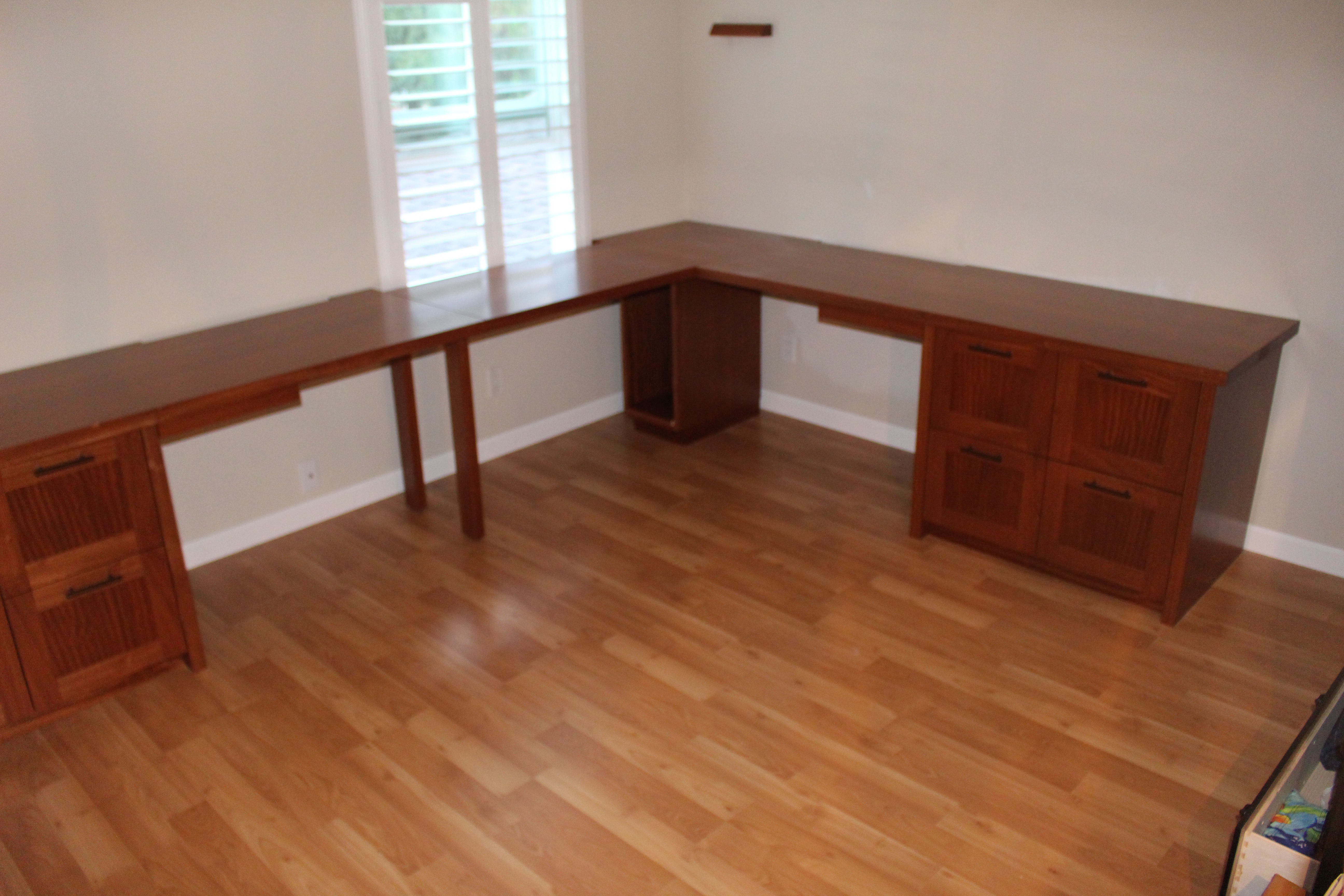 John was inspired by Hawaiian Koa wood and traditional craftsman style furniture. He wanted a spacious desk in his home office but needed to accommodate an existing window.