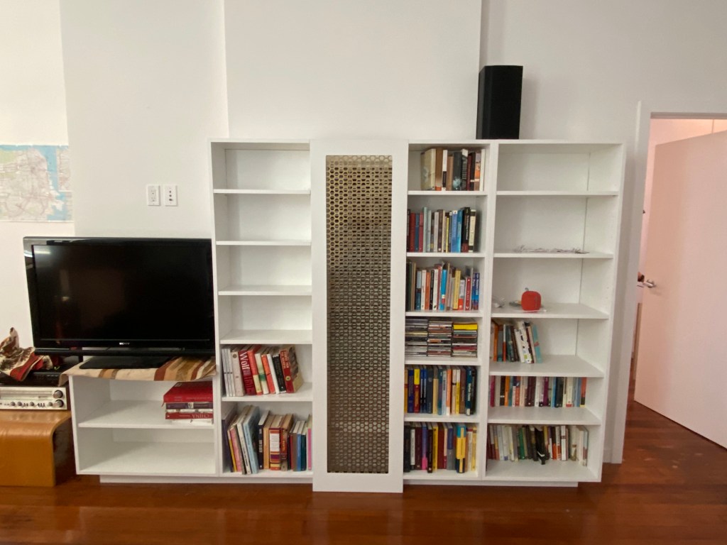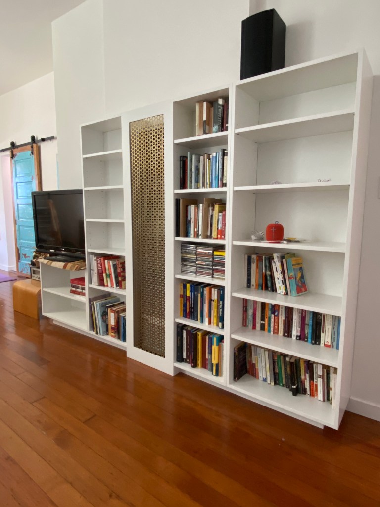 The custom design and build bookcases are made with two handy access points. The back of the bookcases is removable to access the electrical panel and the middle has a magnet embedded heather cover in brass hexagon pattern.