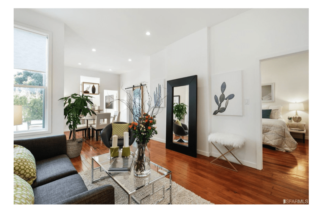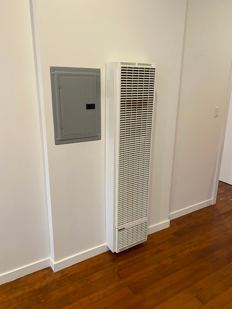 Shishi’s middle unit had the challenge of the center column and an added heater and electrical panel cleverly hidden by the realtor with a large mirror…