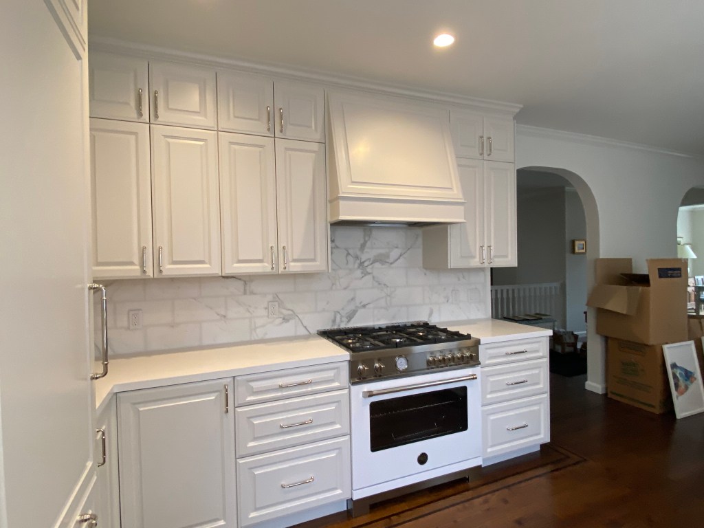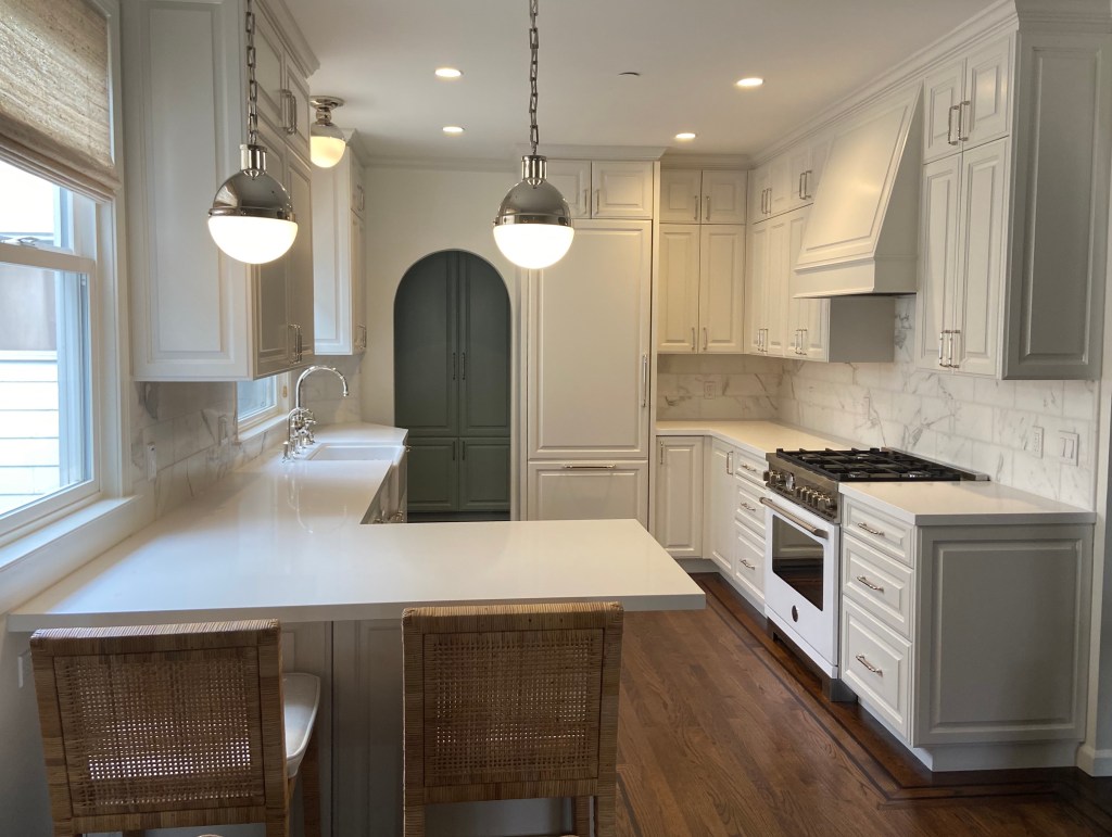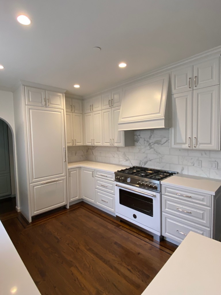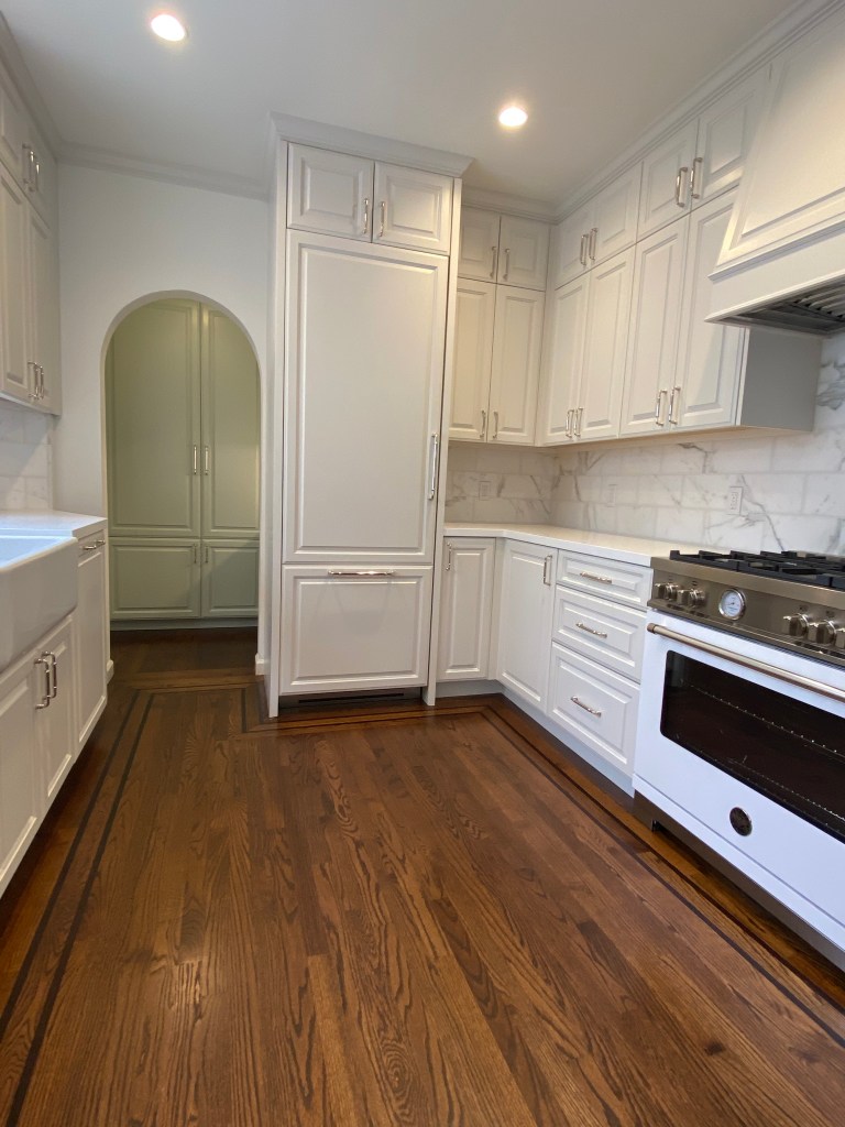 Sometimes we build Kitchens… but only really fancy ones 🙂 like this custom kitchen remodel in San Francisco’s Richmond District. The interior designer embark on a bold plan to make a statement kitchen in a time-less white on white with detailed raised panel doors and European overlay construction. We designed, built and supervised the installation of these paint grade cabinets. All cabinetry was finished on site after installation – the result is a clean look that took the the whole team at Brockley Construction to pull together.