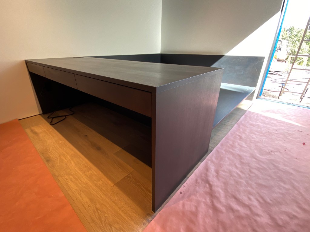 Collaboration with MAK Studios to build a custom platform bed with integrated desk. This sleek design does it all for a modern zen bedroom.