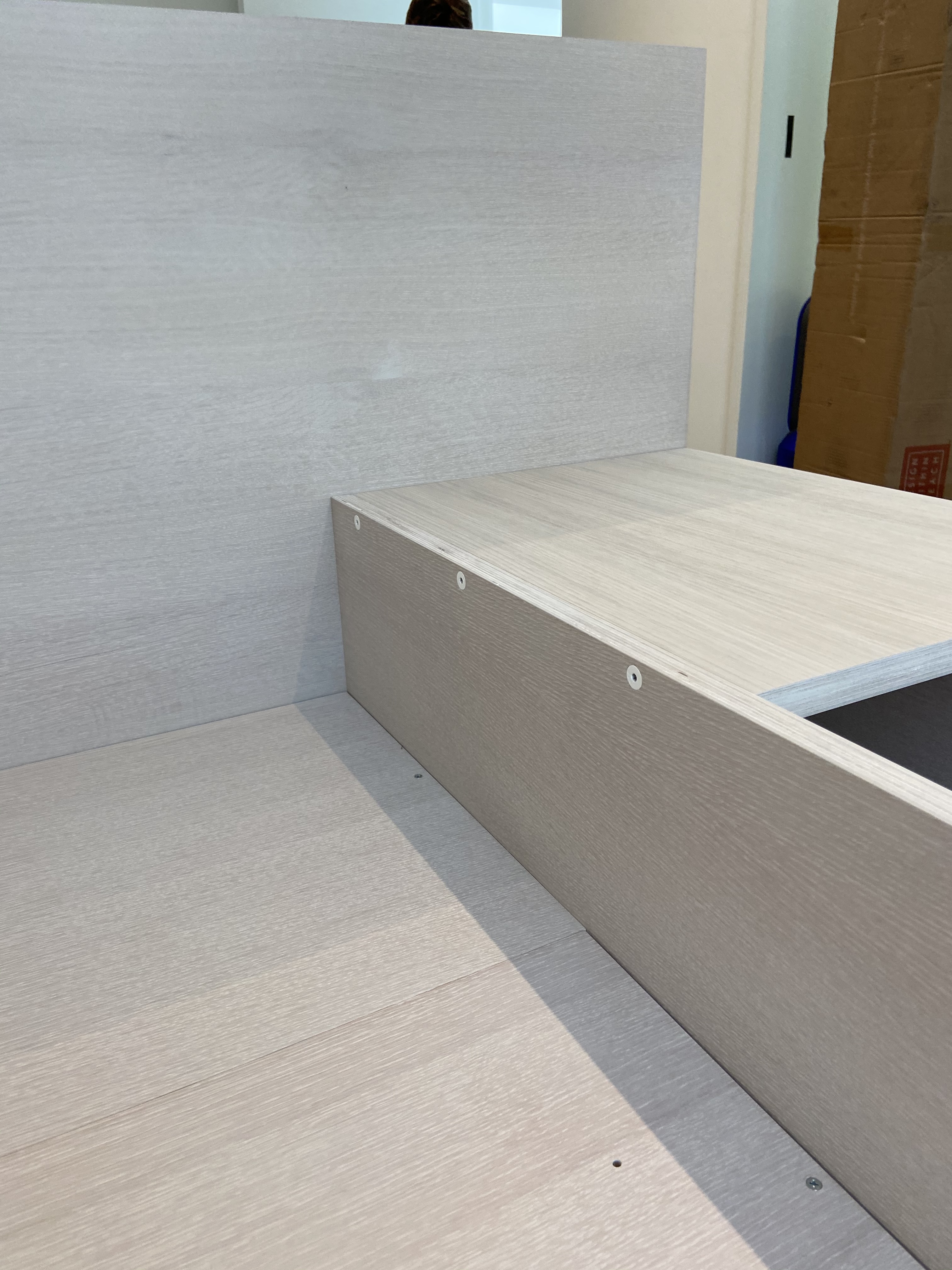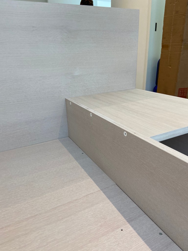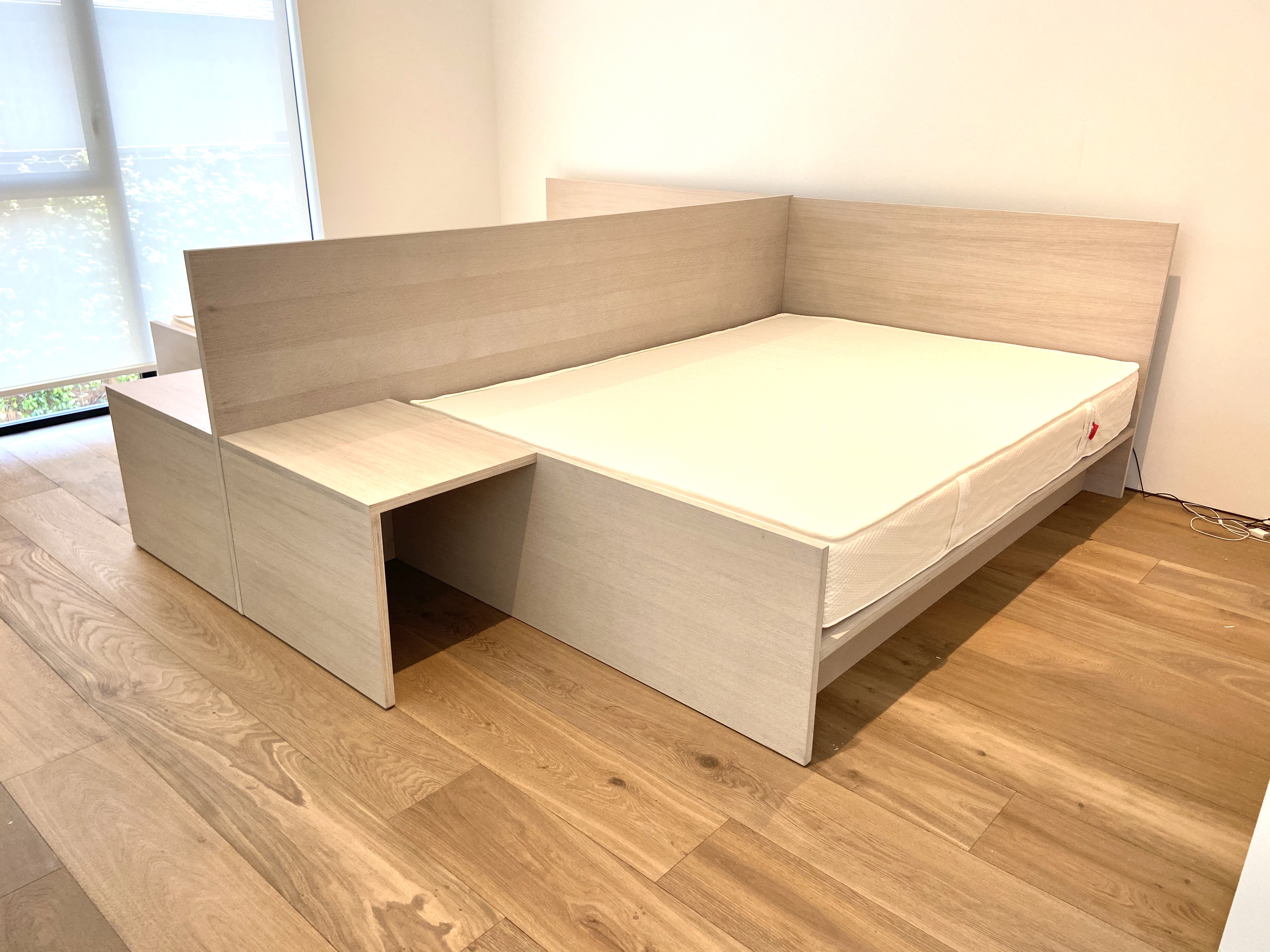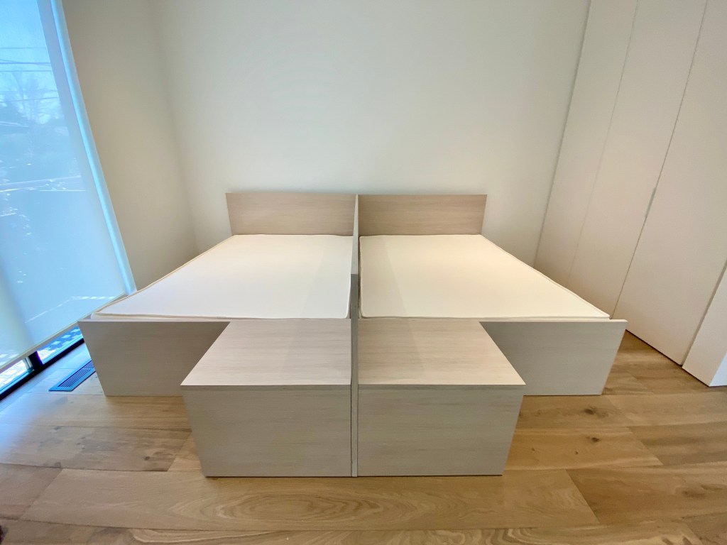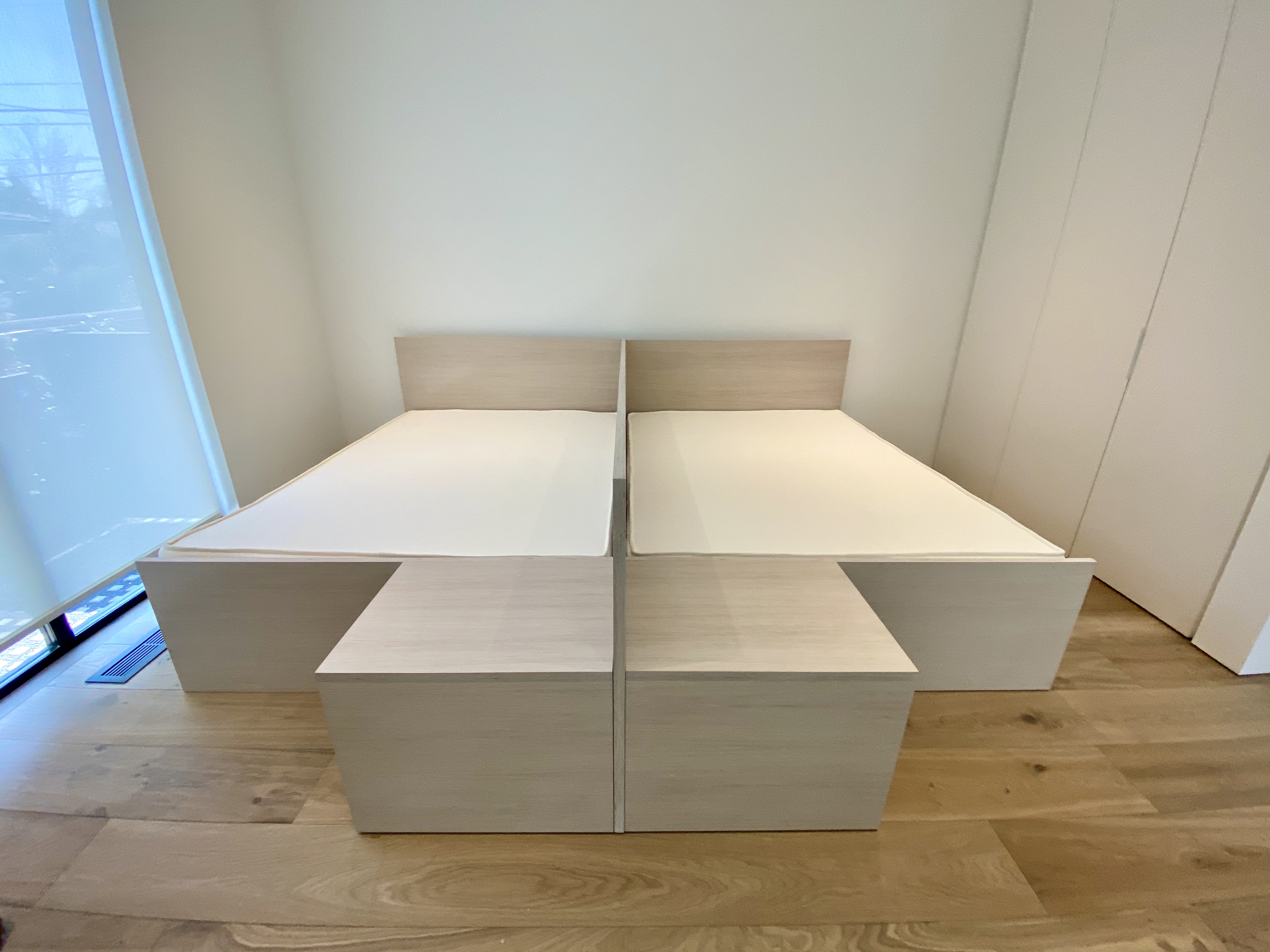 Two young boys loved to sleep in the same room, but they were growing up, and getting bigger, and this family needed a bed solution that would work now with co-rooming and be to be stand alone bed for big boys when they are ready. These two double beds with foot chair are designed to come apart with a removable center divider. Clean modern design with detailed execution.